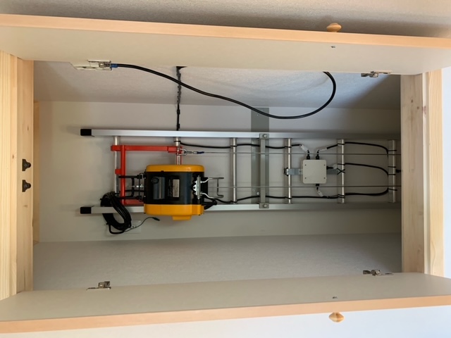 レール全長4.8m 特注L型台車(W510×D500×H500) 積載荷重:上昇時下降時とも50kg 上限下限リミット装置