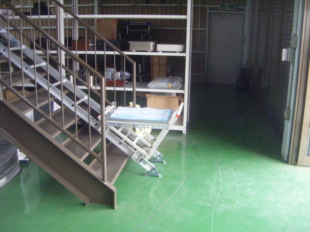 2階台車停止位置。このタイプは階段から斜め方向に1800ほど延びます。