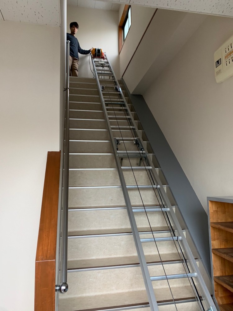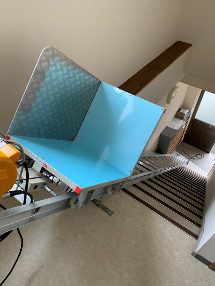 2階台車停止位置。2階の踊り場寸法が短い為、台車が少し階段部にかかっています。