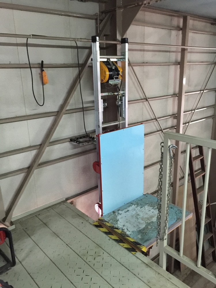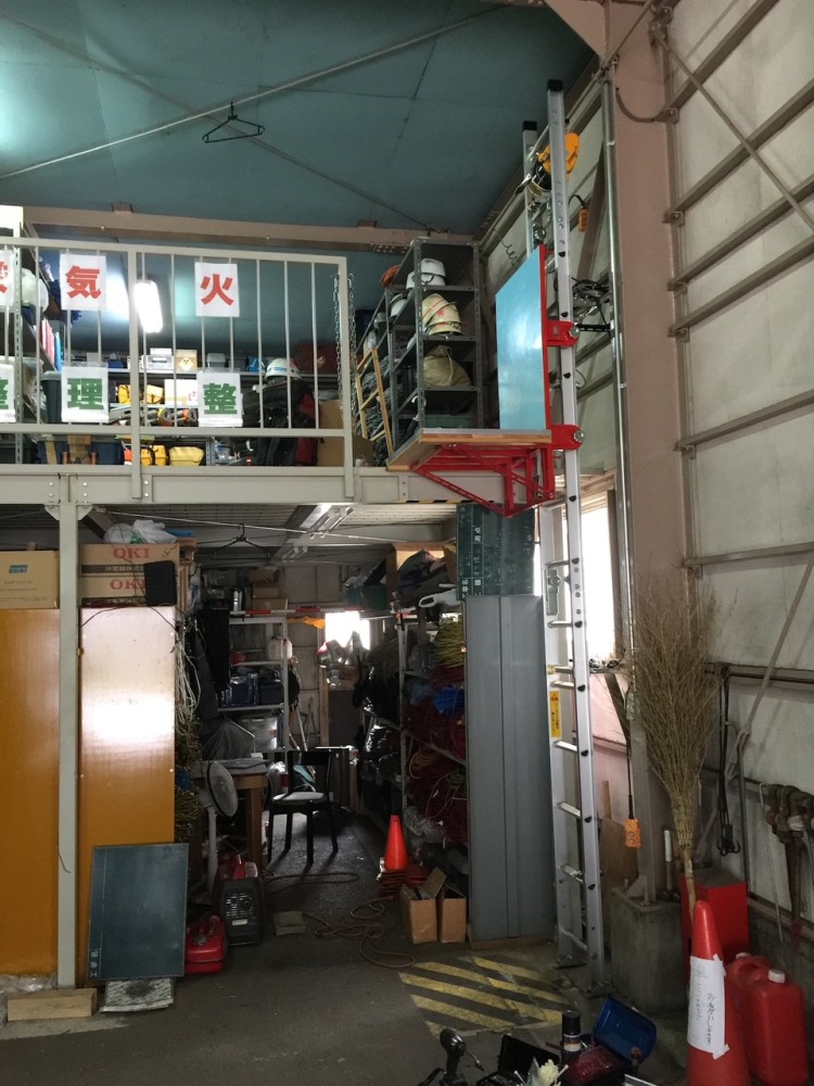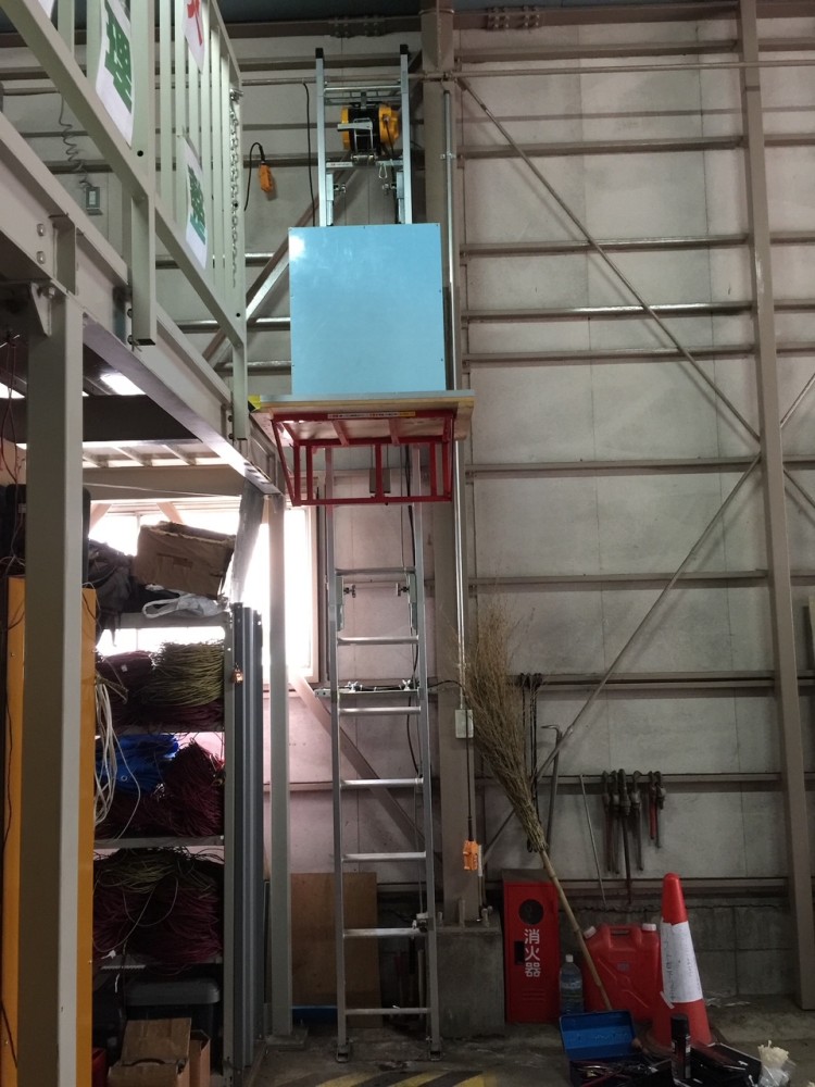 624式レール全長4.3m 標準台車(W650×D500×H1200)鋼材補強・板張り 積載荷重:上昇時100㎏・下降時60㎏ 倉庫内、中二階への荷揚げ荷降ろしに使用。