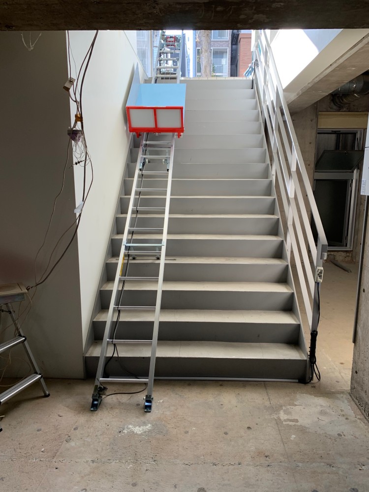 台車移動時。レールはしっかりと階段に固定しています。レール幅は410です。