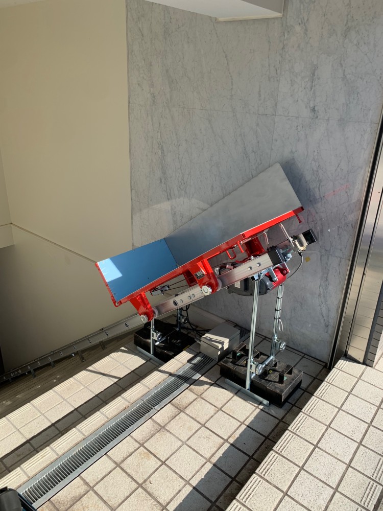 上階の階段(床面)がタイル張りの為、20kgの重りを8個使い、ブレ固定をしております。