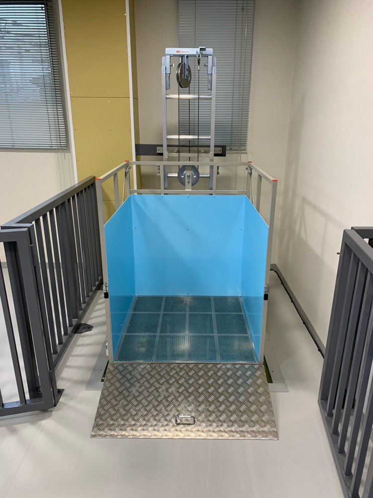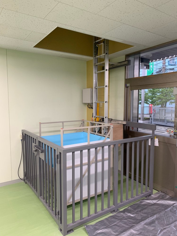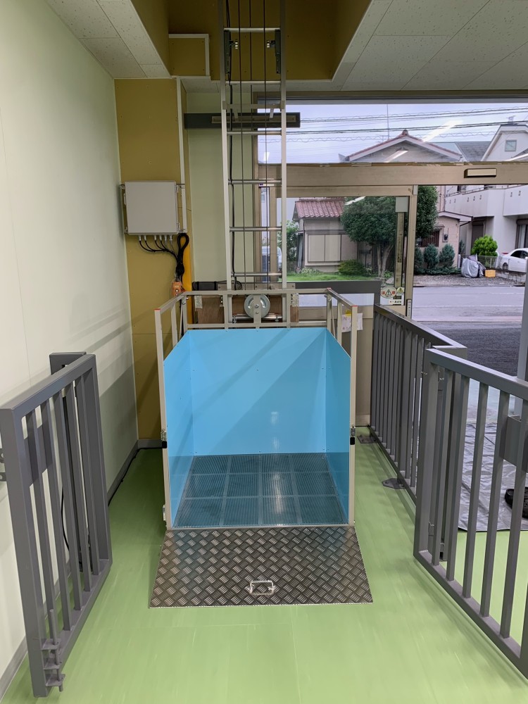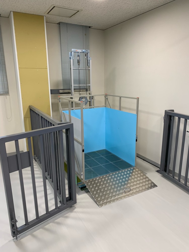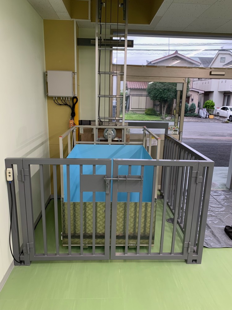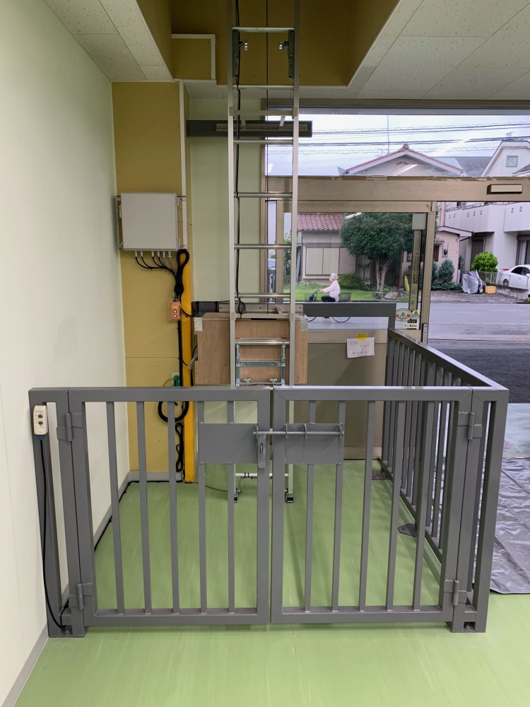 1階柵扉が開いた状態、台車スロープも開けています。柵扉とスロープには無線式のセンサーを設置、全て閉まっていないと電源がオンになりません。