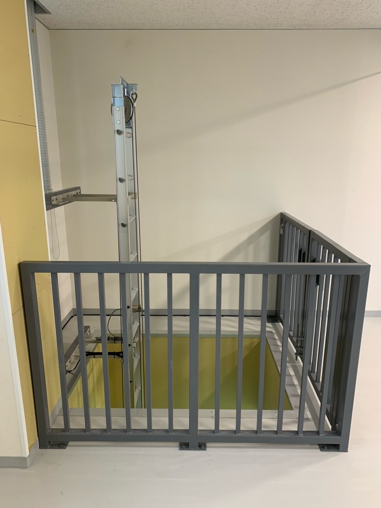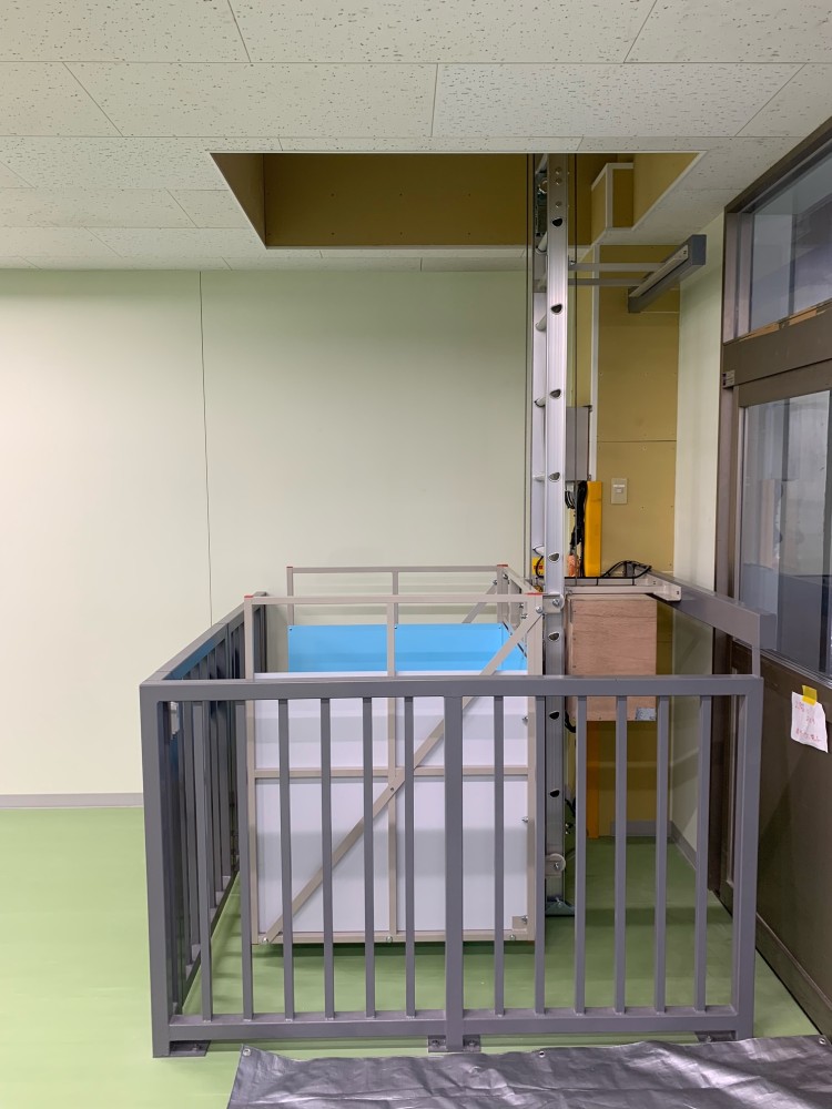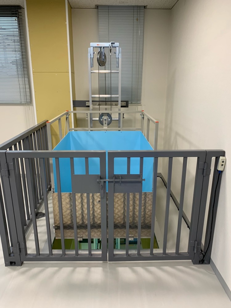 台車が1階にある時の2階の写真、2階部は開口部があり特に危険の為、安全対策として柵の設置をしております。