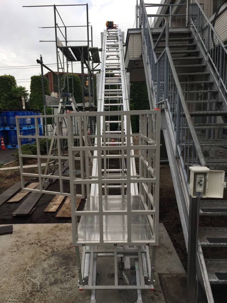階段リフト正面からの写真。上階の方には足場を設置しての作業となります。