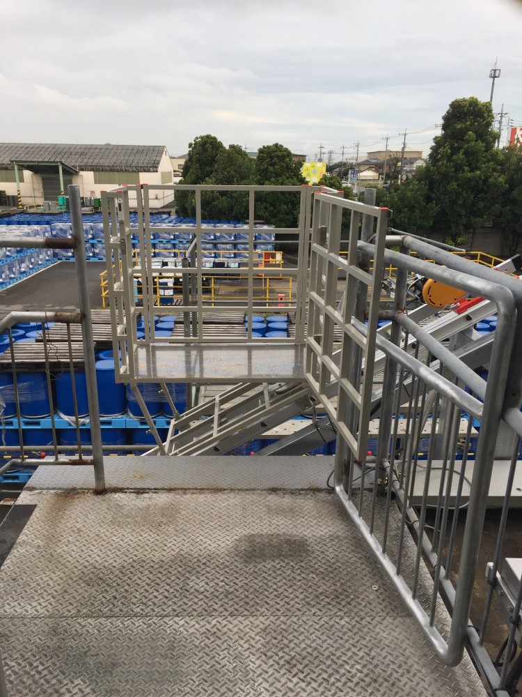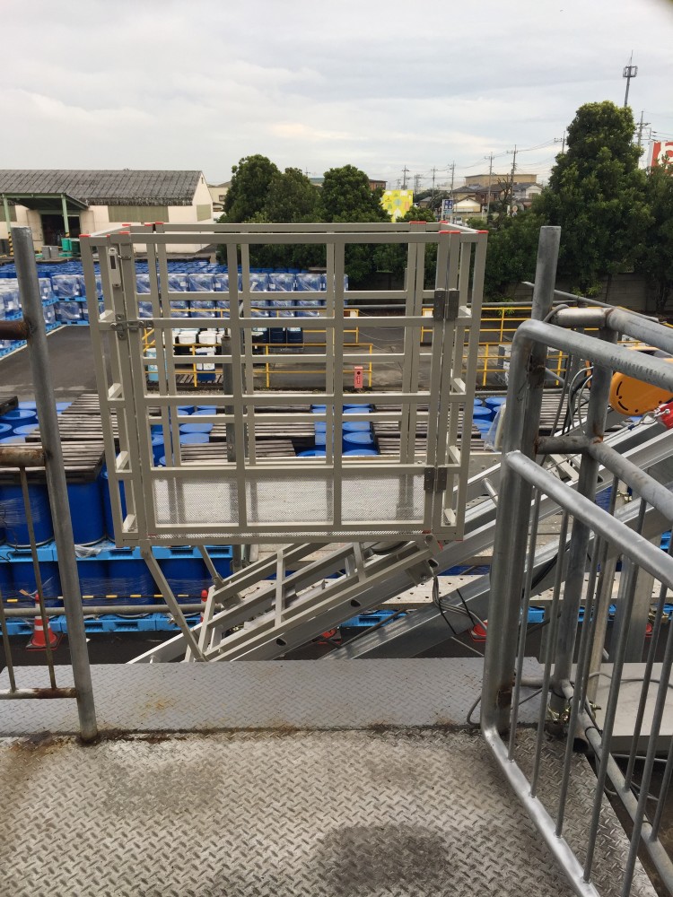 2階台車停止時、階段踊り場にも柵扉を設置。