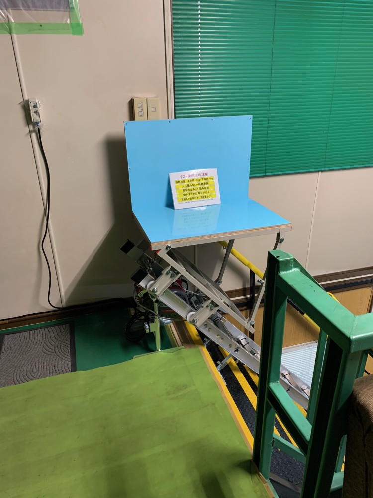 2階台車停止時。台車床面の三分の二ほどは階段にかかります。