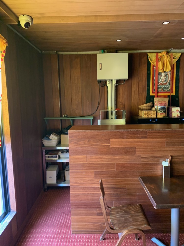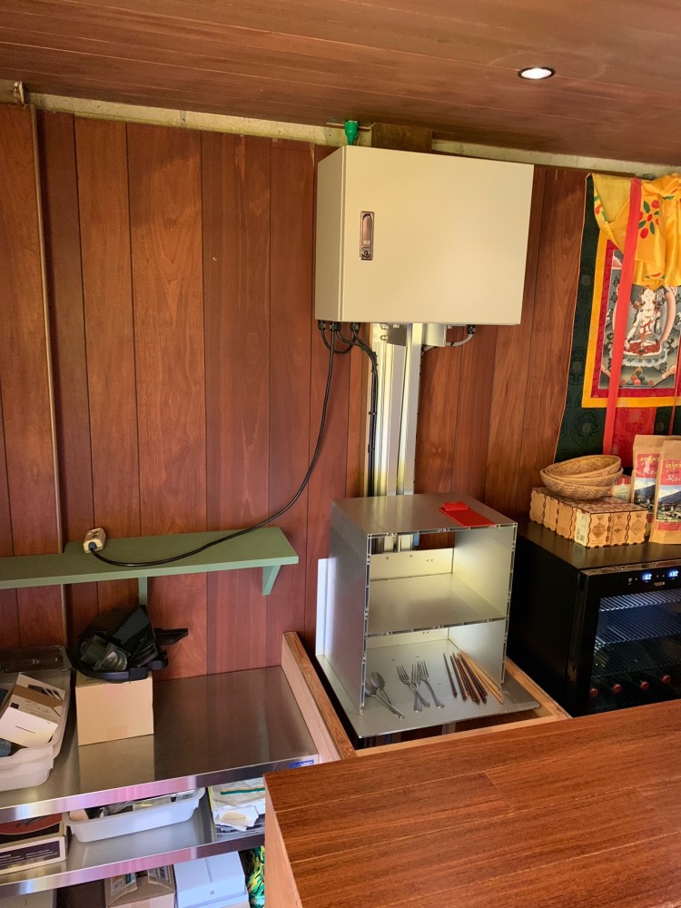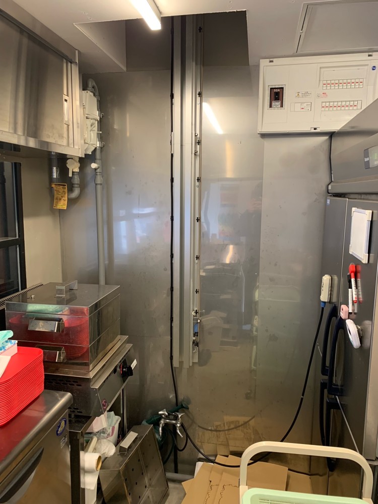 カウンター越しのアゲチョイ。台車停止位置はいつでも調整可能。ここの電源コンセントは天井部に流れています。