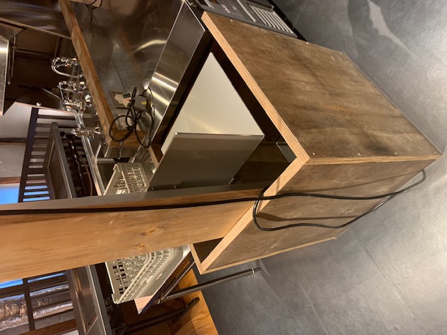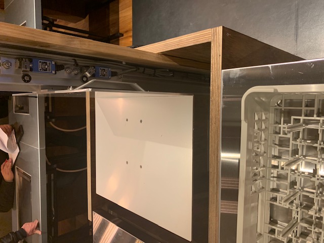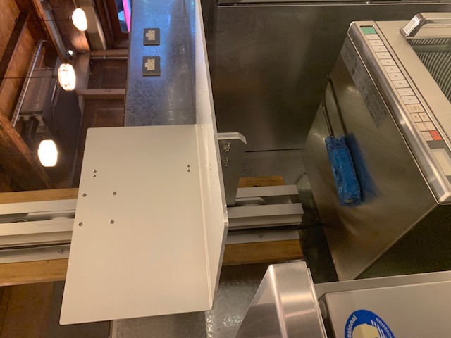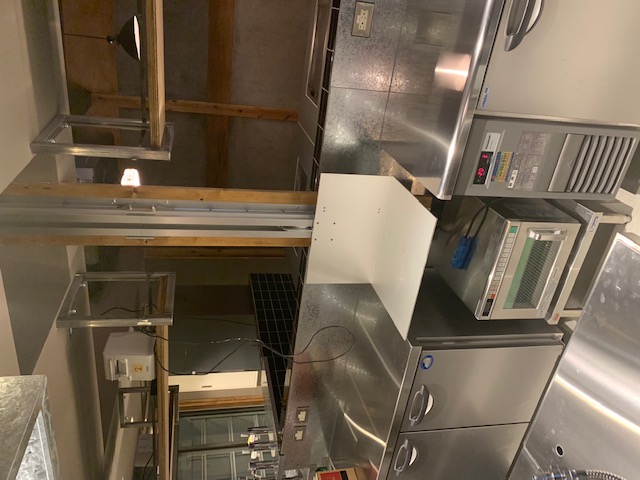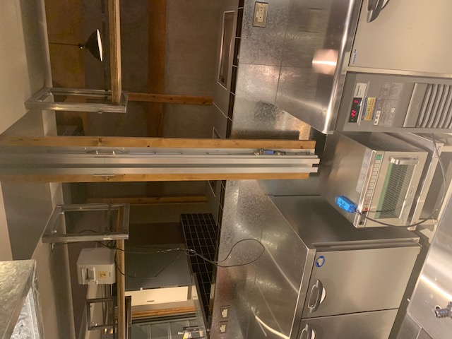 台車1階停止時、正面。台車停止位置は作業台等と同じ高さ。また下のスペースにはレンジが置けます。