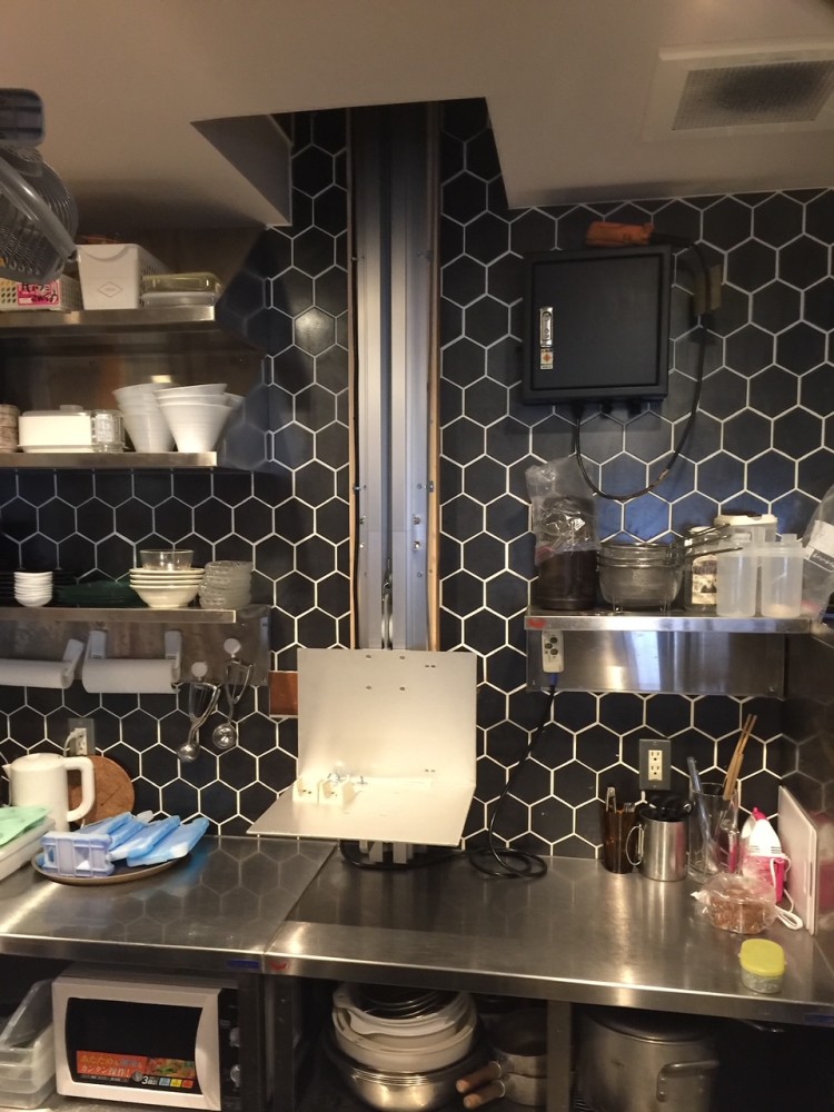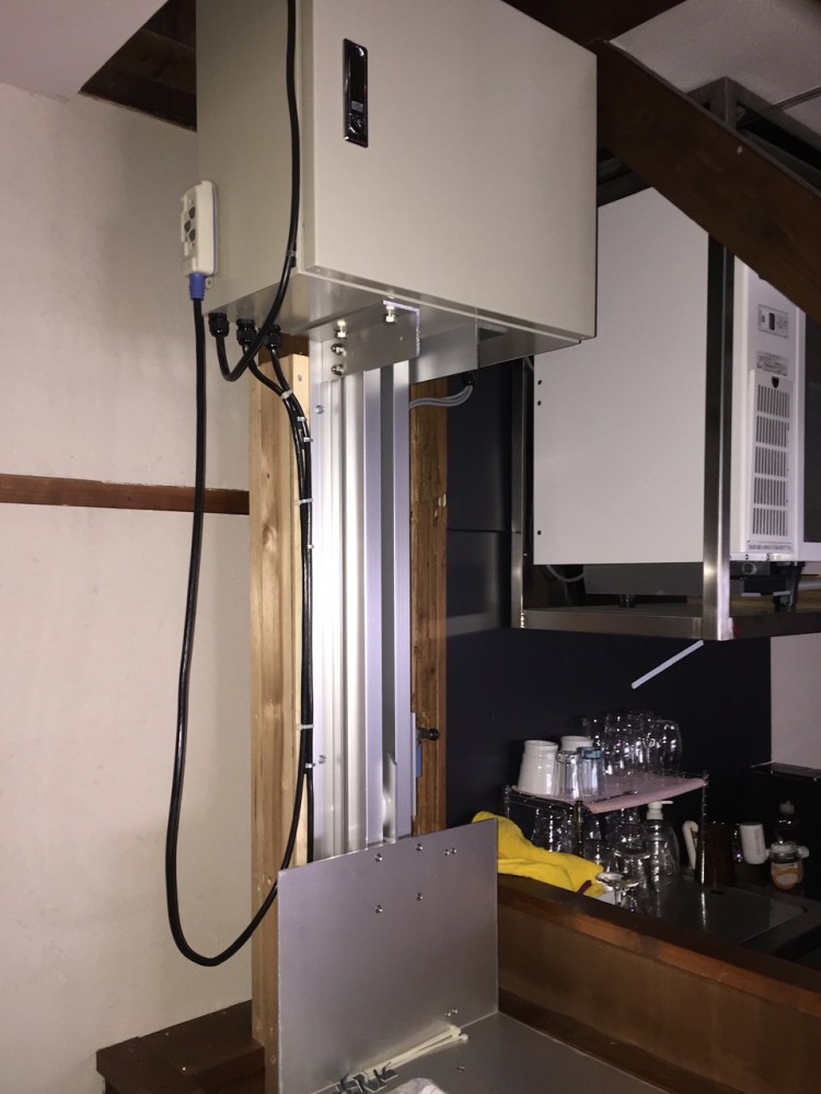 台車が上に行くとレールのみが残ります。壁面がタイル張りだった為、板張りをお願いし、そこにアルミレールを固定しております。