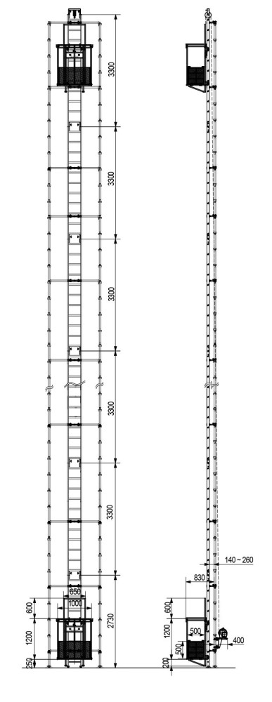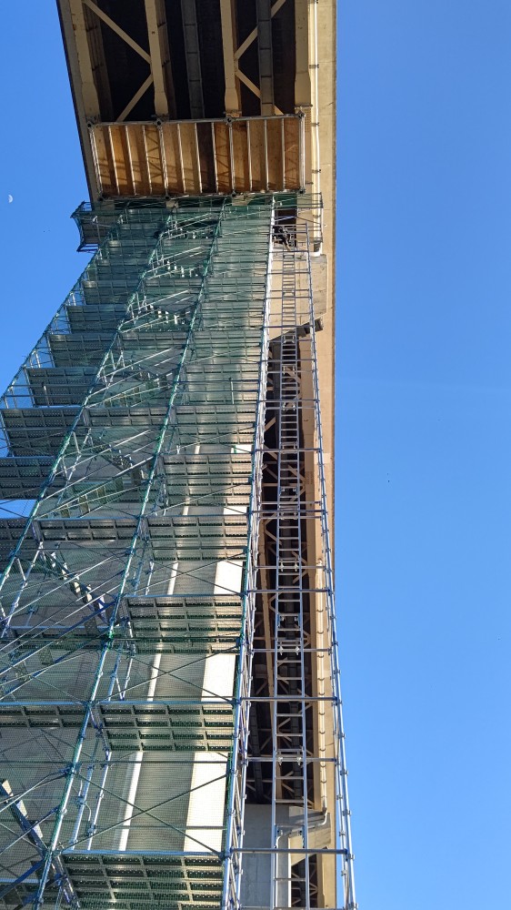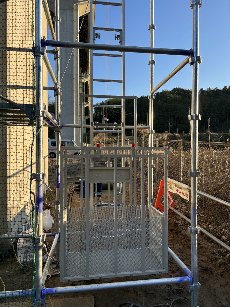 橋脚改修工事 高さ30m 足場内部で昇降 荷揚げ用専用リフト