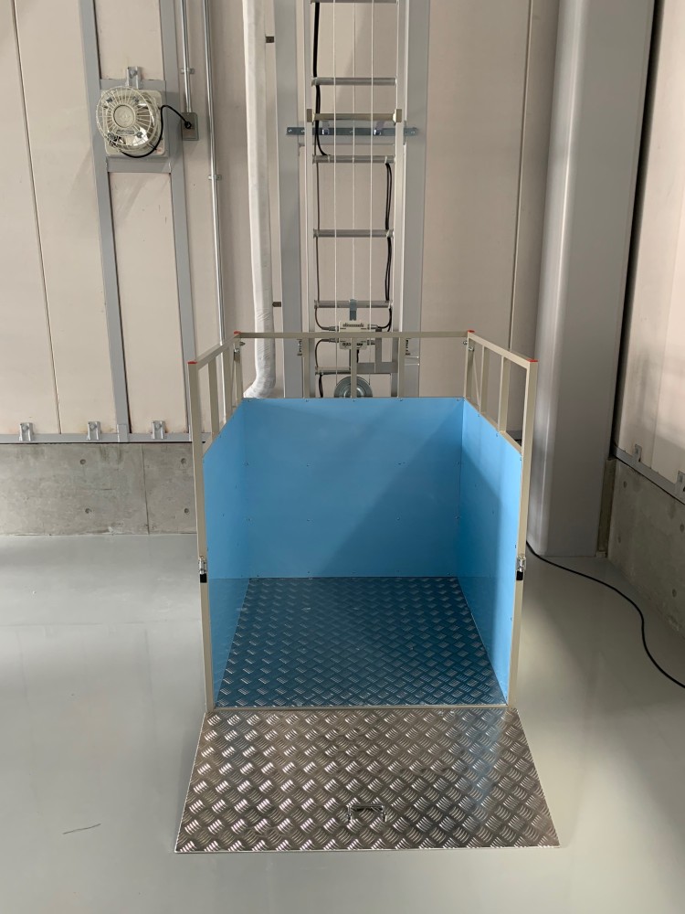 全長9.3m 特注箱型台車・内寸W950×D975×H1000(前面スロープ付き) 上限下限リミット装置 最大積載荷重:上昇時120kg・下降時120kg UP711ZNウインチ使用