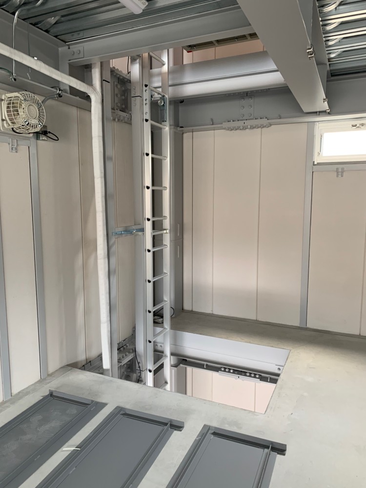 3階部、正面から。開口部と台車の隙間は、手前・左右とも100あけております。