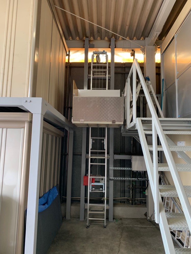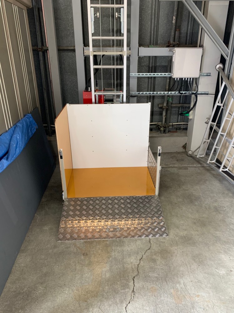 リフト全体。台車は2階に停止時。この台車の下のスペースは荷物の仮置き禁止です。