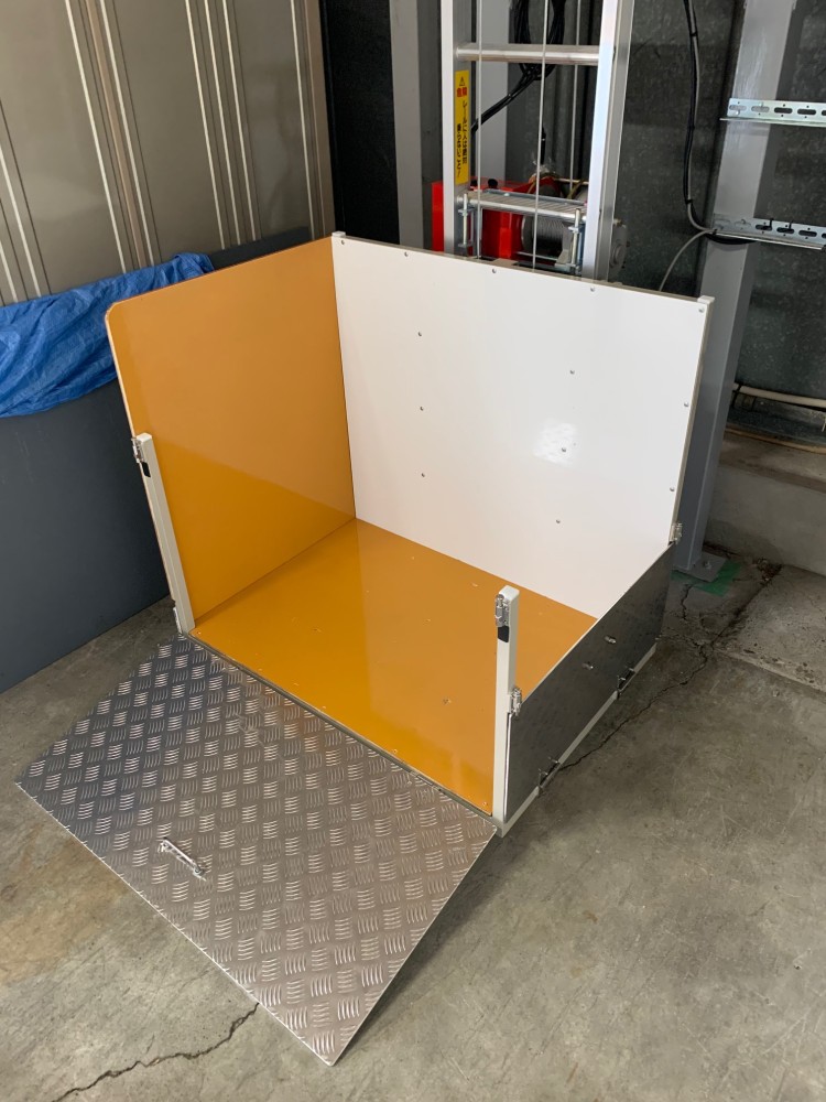 全長3.9m 特注一体型台車・内寸W950×D650×H860・前面+右側面スロープ付き 上限下限リミット装置 扉センサー・スロープセンサー付き 最大積載荷重:上昇時下降時とも120kg UP711ZBウインチ使用