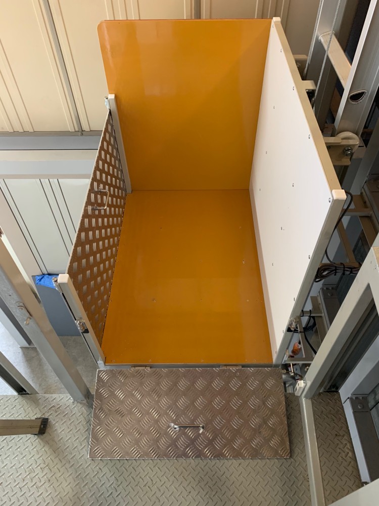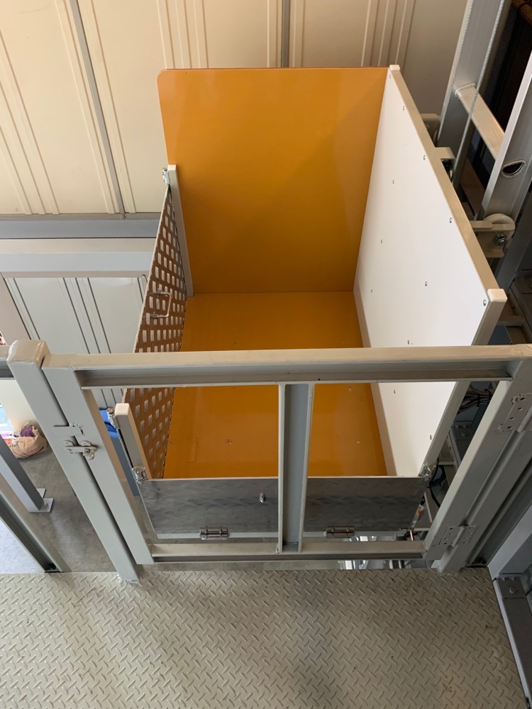 リフト全体。台車は1階に停止時。正面から積み込み、2階は手摺り扉を開けて取り出します。
