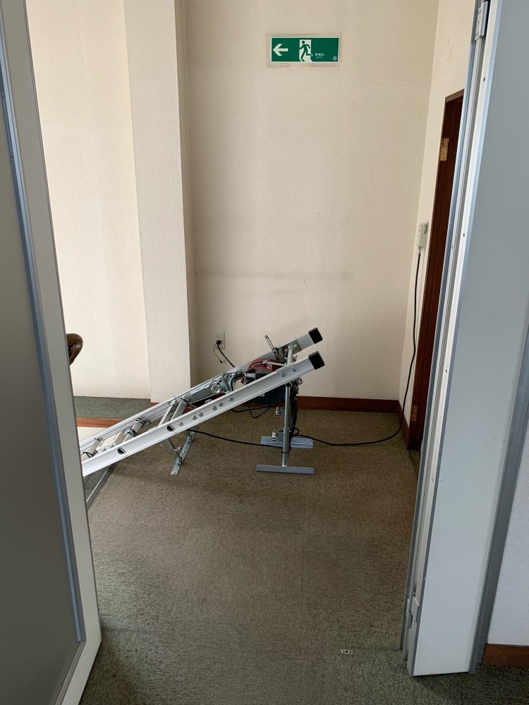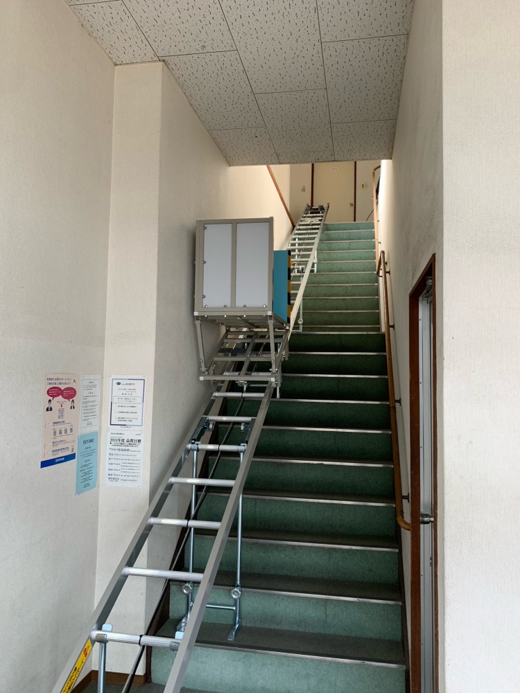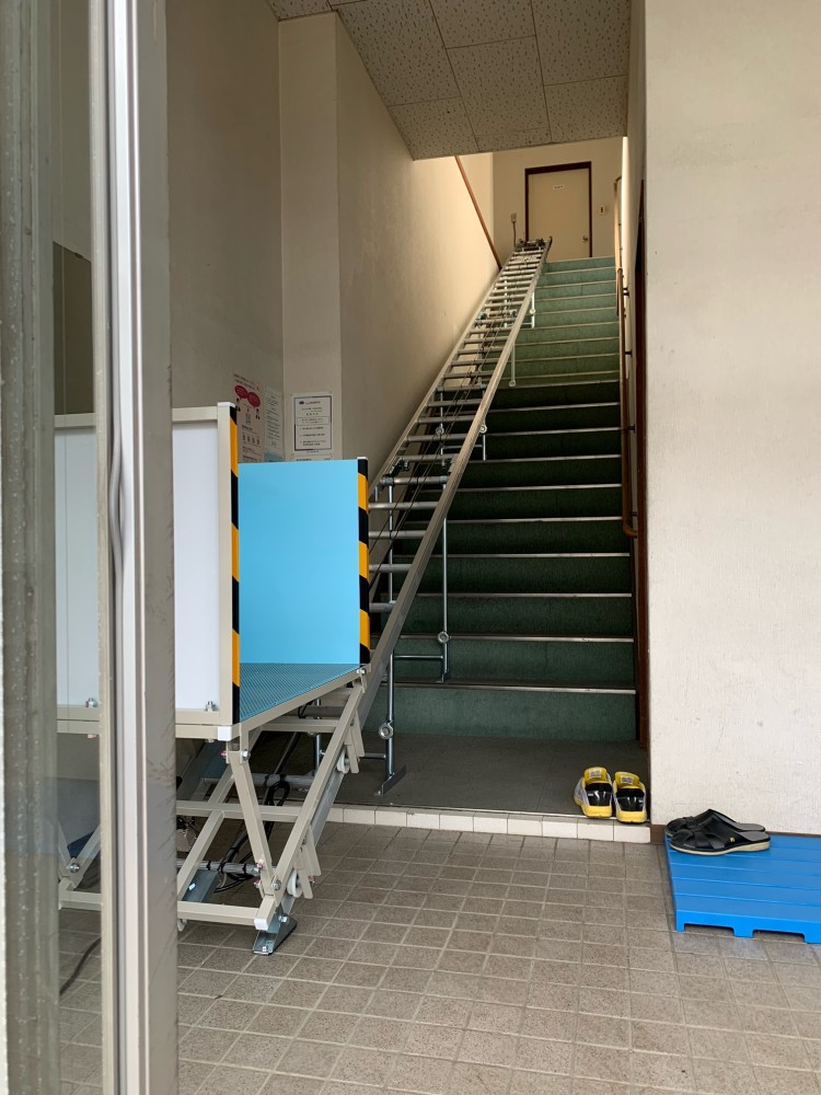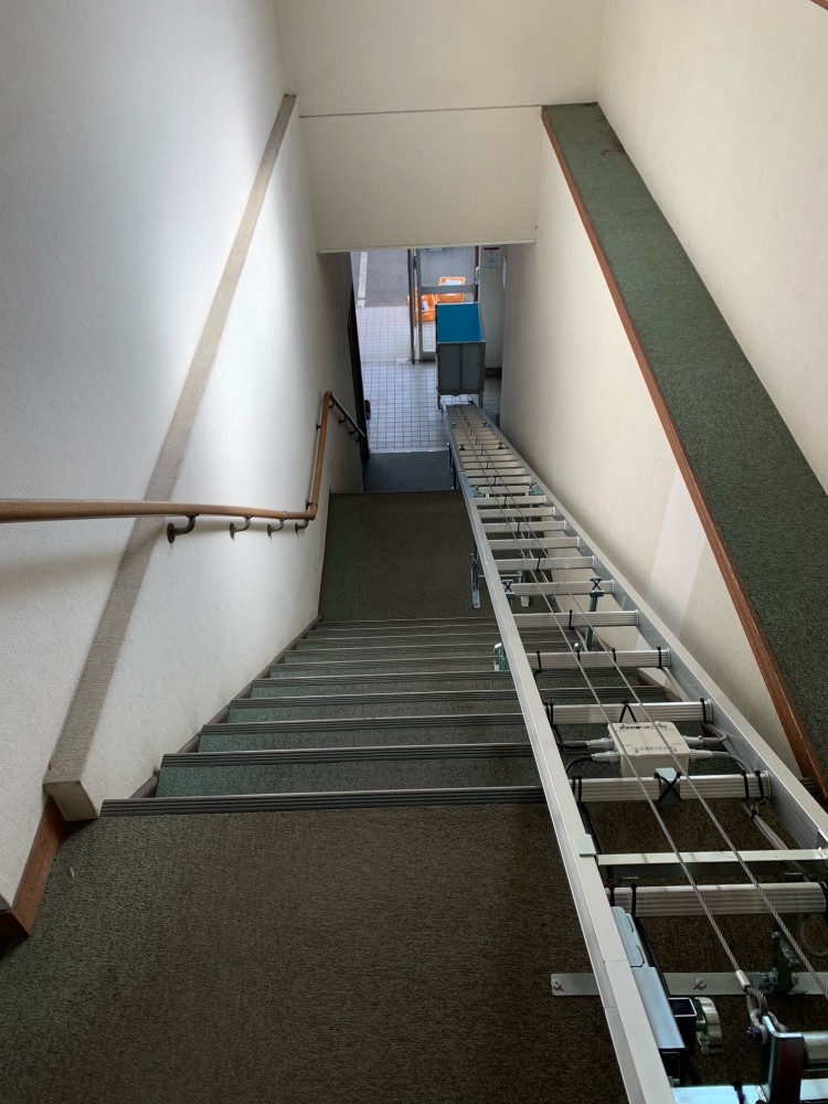 台車、2階に停止時、階段からの写真。この見方で言うと台車幅はW510、歩行帯もしっかりと確保が出来ております。