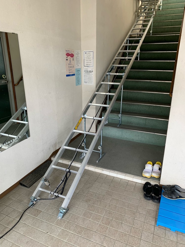 台車、階段途中時の写真。階段途中には1階の天井がだいぶ近い所にあります。ここはH600の立ち上げから約200ほどしか余裕がありません。設置時の現場合わせでもどうにもならない事が多いので注意が必要です。