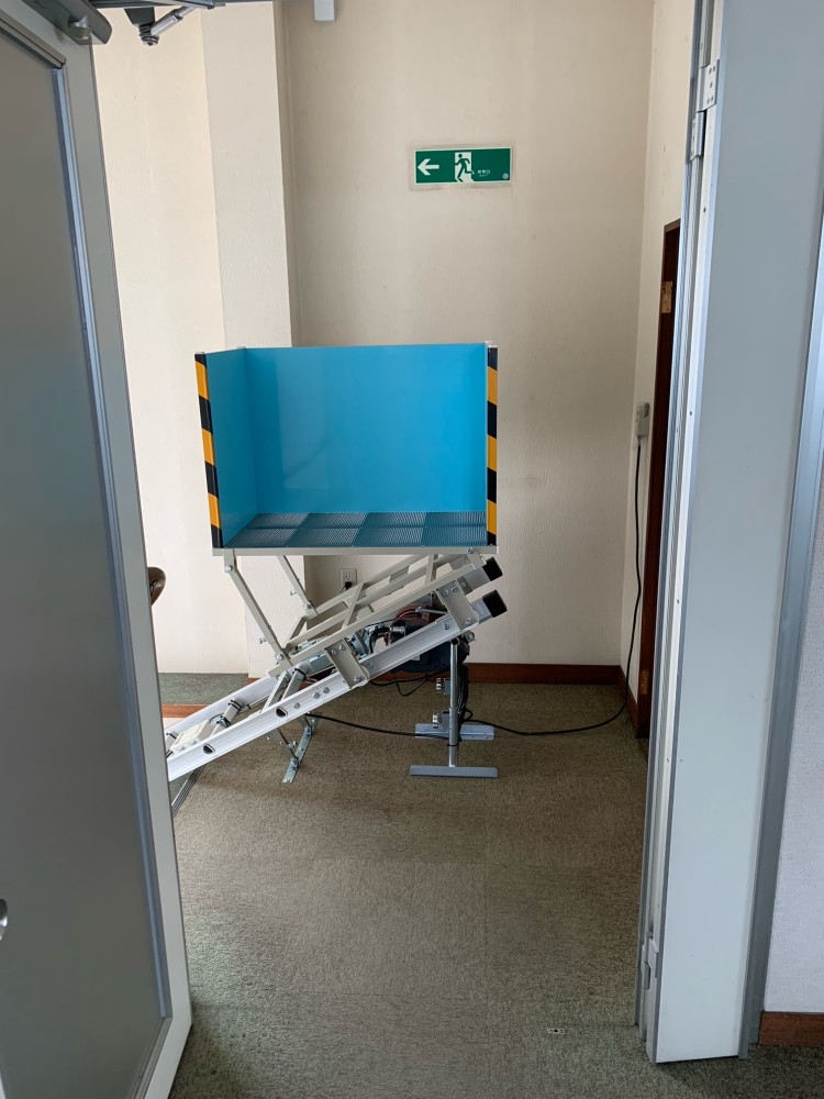 1階台車停止位置。台車横幅は内寸でW850。水平面の高さはH600ほどになります。積み降ろしがし易い高さです。