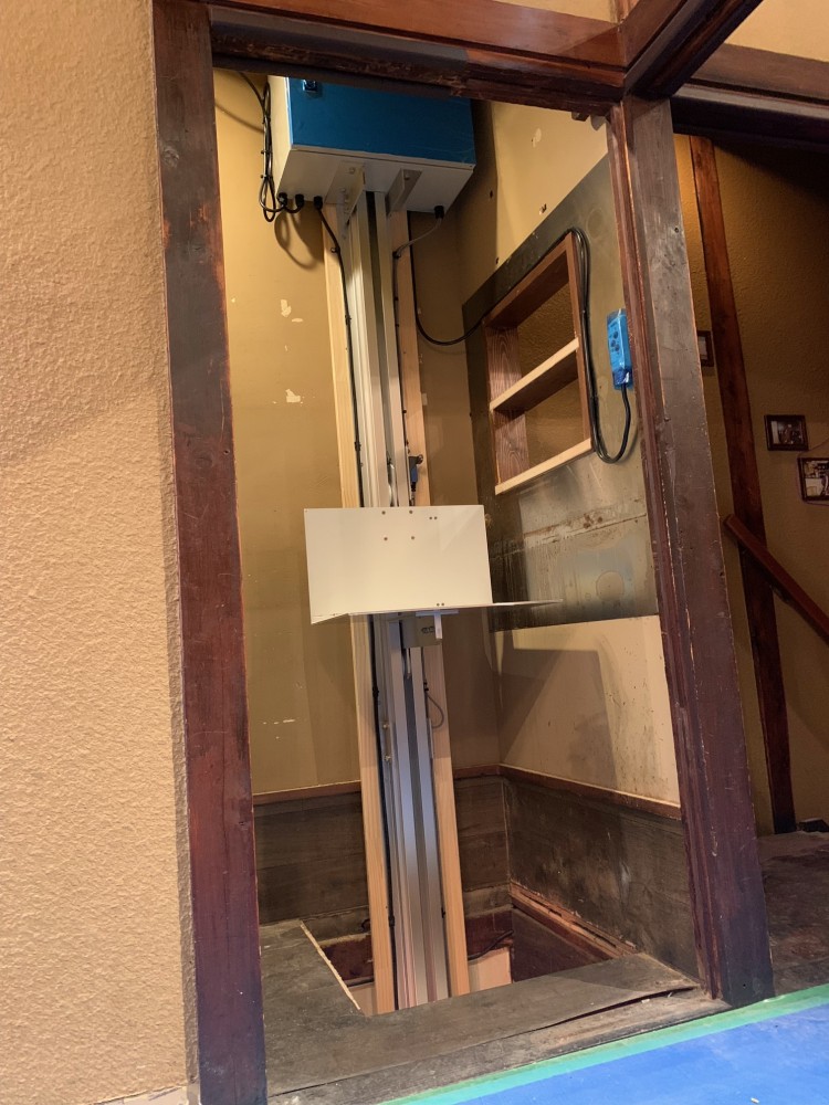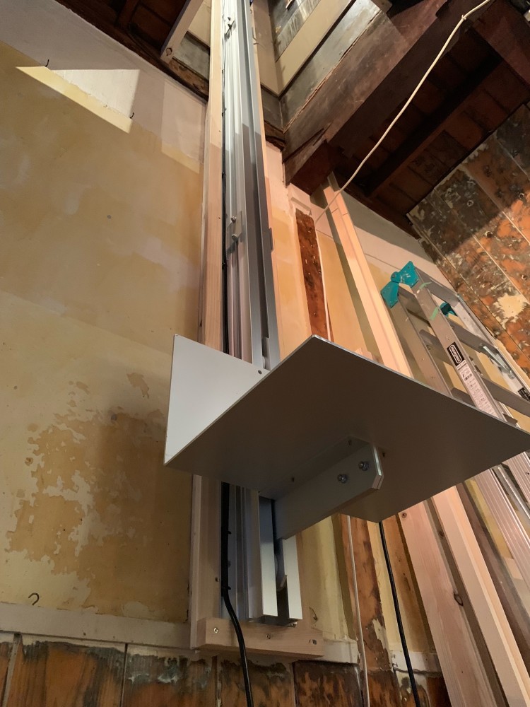 2階部、正面からの写真。台車停止位置はリミットで調整をしております。腰壁の想定高さで台車位置を決めましたが、13のスパナがあれば高さは自由に変更可能です。