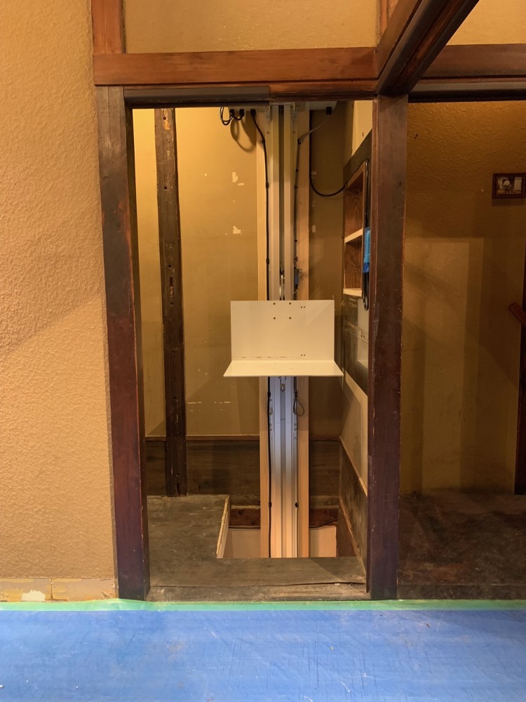 1階台車停止位置。図面を見て現場採寸をし、1階の台車停止位置(高さ)を決めます。操作リモコンの処理は後程、内装工事が完了後にお客様の方でお願いをしました。