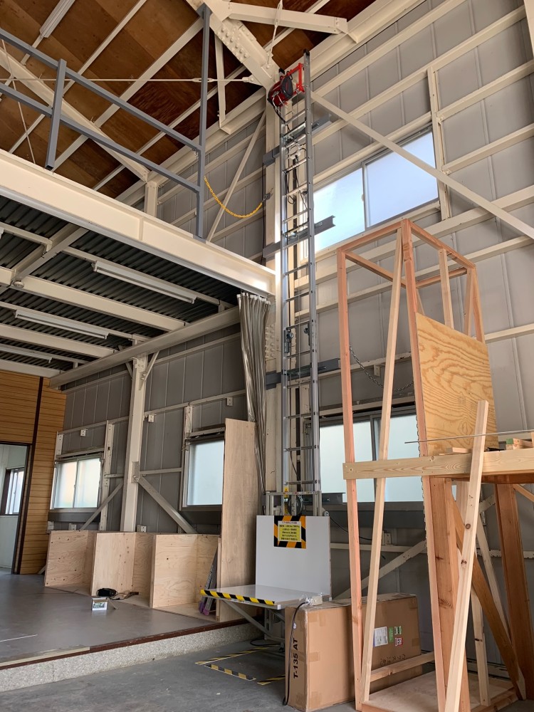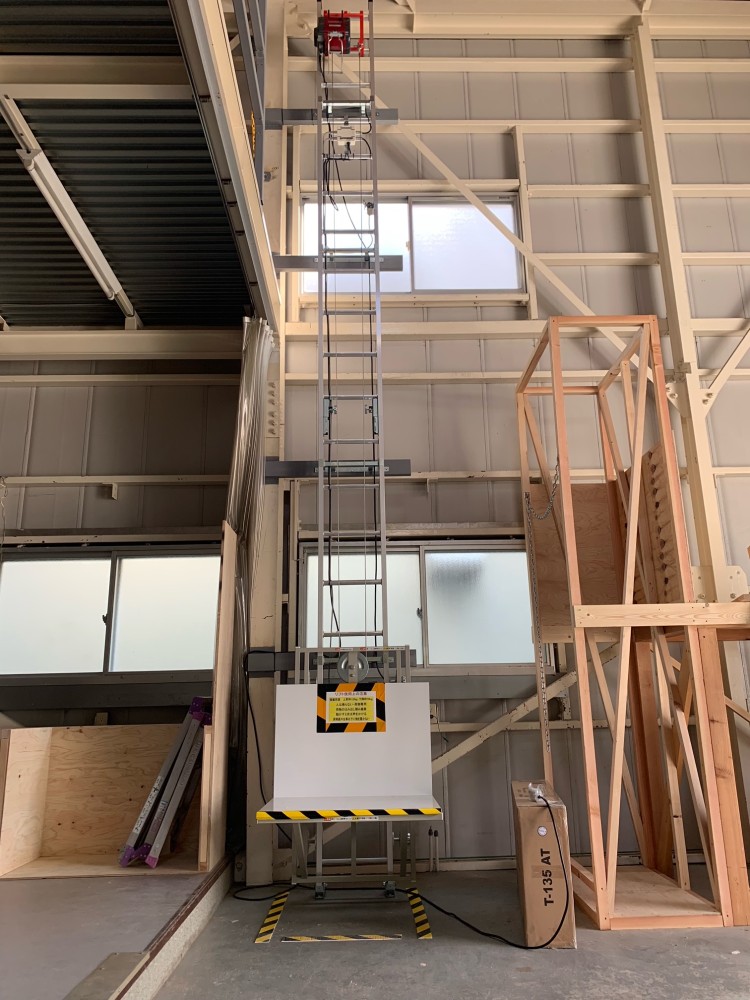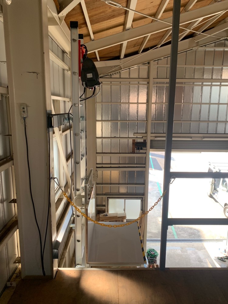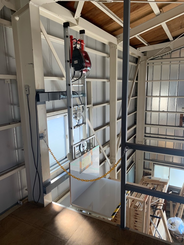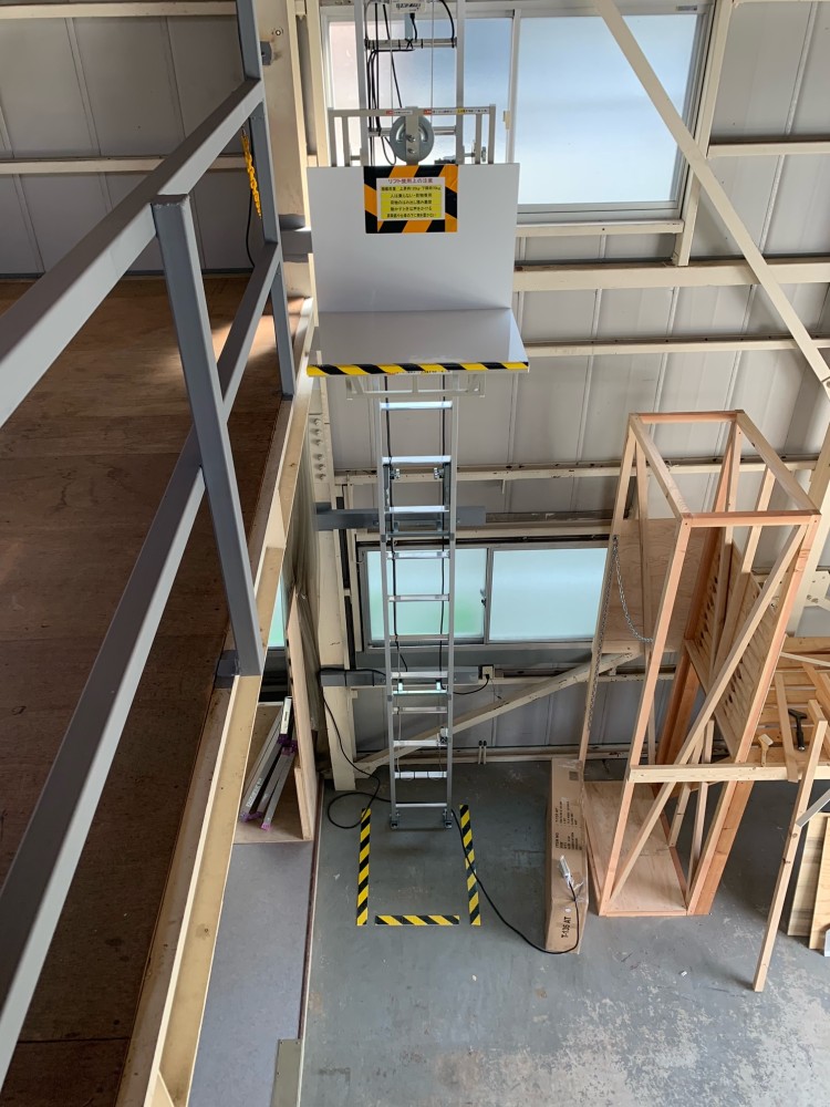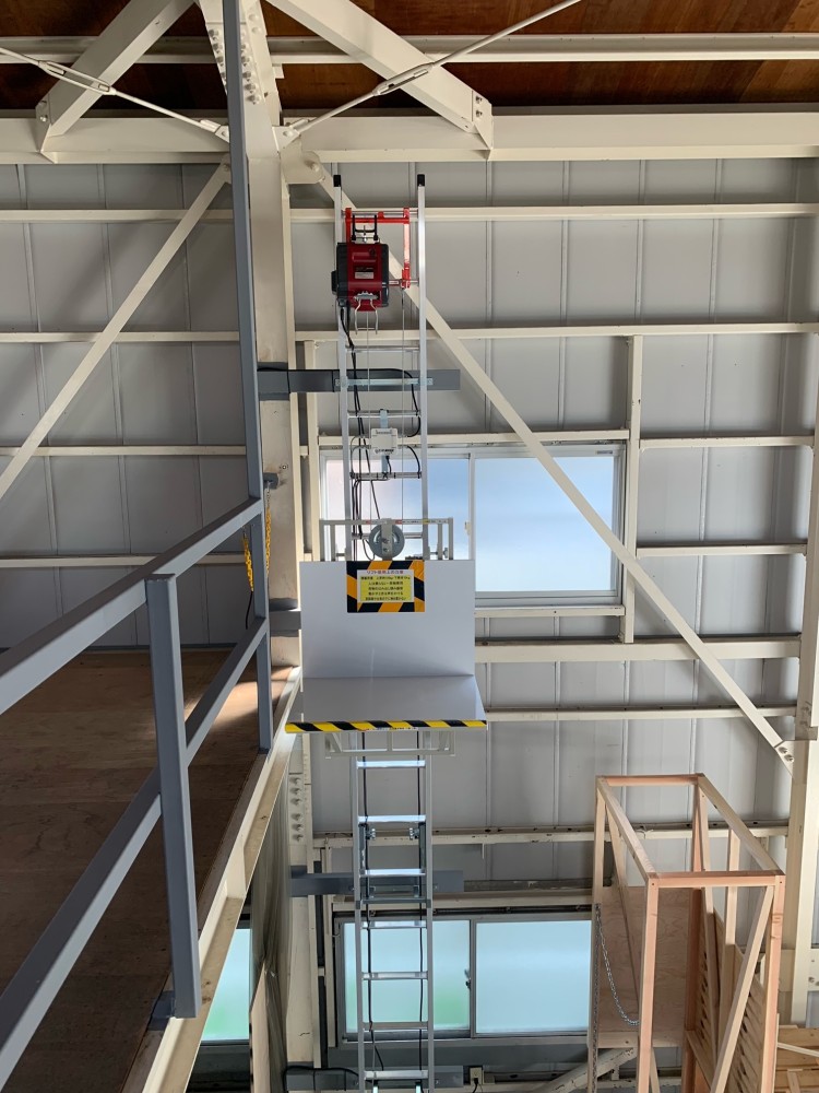 2階台車停止時、斜めから。2階開口部には黄色のチェーンをかけました。開口部は特に危険ですので、使用しない時はしっかりと注意喚起をして下さい。