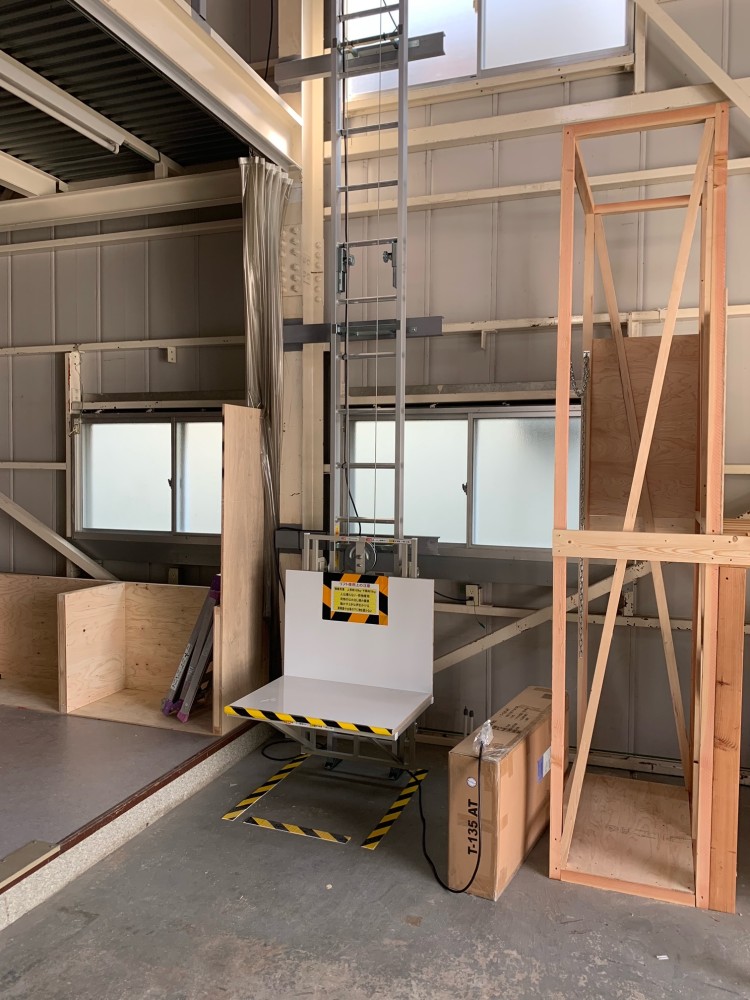 2階台車停止時・正面から。台車が2階にある時、1階床面のトラテープが重要になります。荷物の仮置き、人の通行も禁止にして頂く様お願いしました。