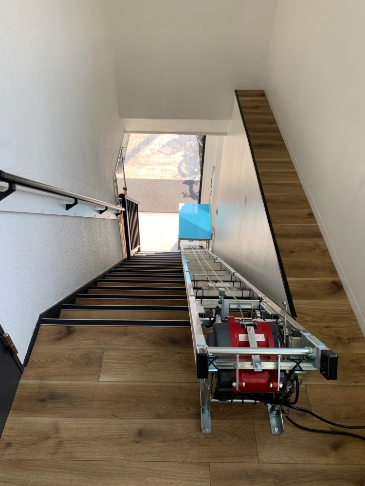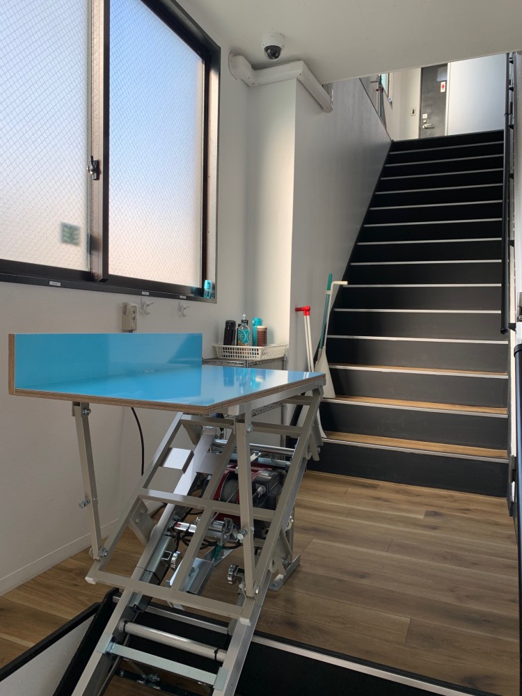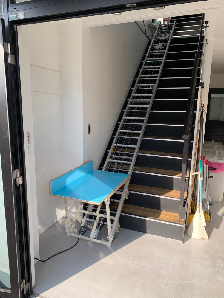リフトに必要な幅は最小でW560です。現状でも歩行幅も確保できておりますが、大きな物を運びたくてリフトが邪魔な場合は、リフトの撤去・再設置も可能です。正式には「仮設式荷揚げ機」ですので撤去後の保管も省スペースに出来ます。