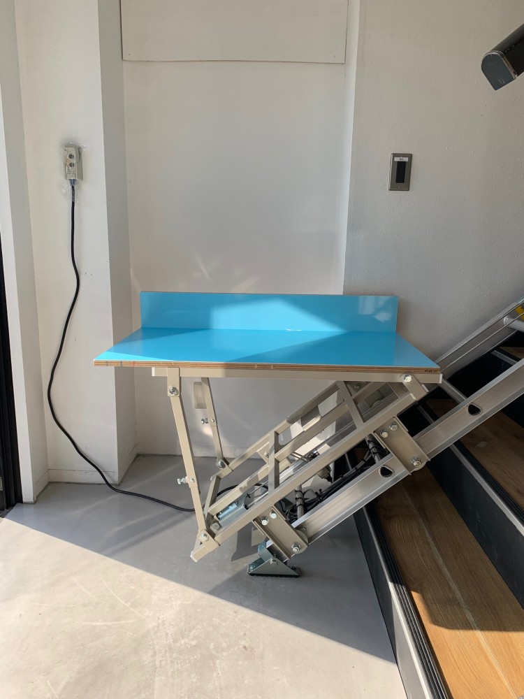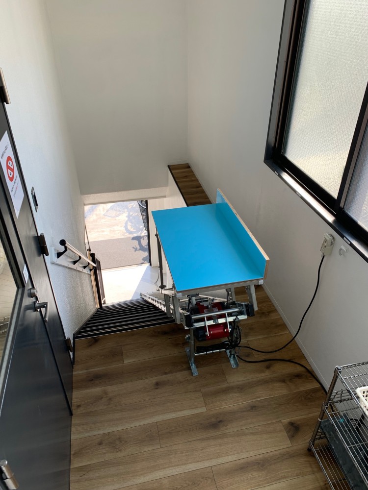 台車1階停止時、台車水平面の高さはH700ほどです。階段1段目には台車水平面がかかりますが、荷物の積み降ろしはし易い形になります。奥の壁には操作リモコンがありますが、手前側でもどこでも持ってこられます。