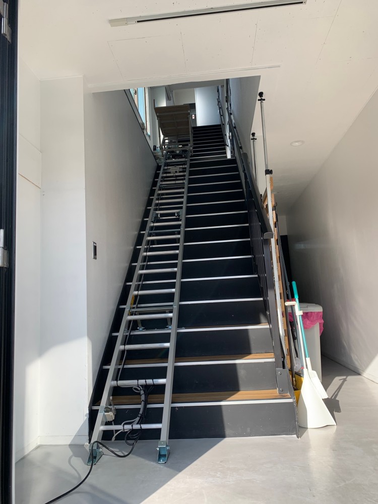 台車が2階にある時はレールのみが残ります。レール最下部の床面には荷物の仮置きも禁止です。(台車がぶつかり下がりきらない為。)写真はありませんが、リフト設置後にお客様の方でトラテープの貼り付けもして頂きました。