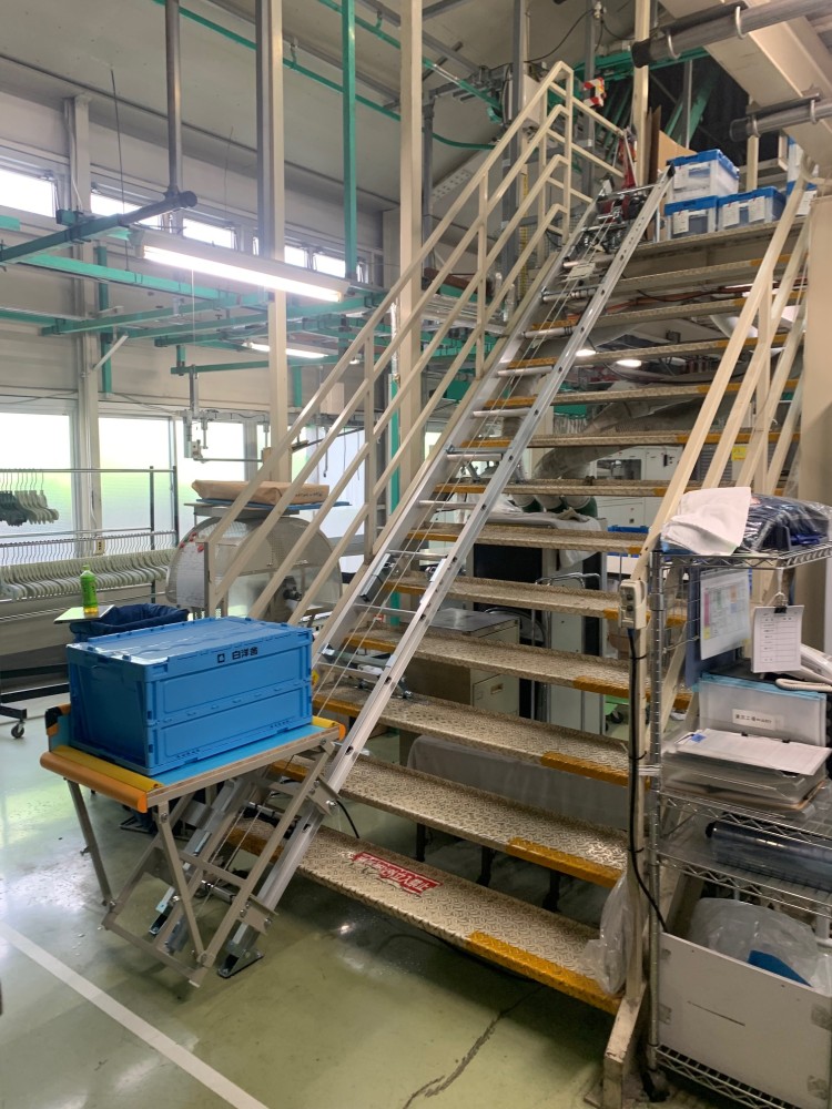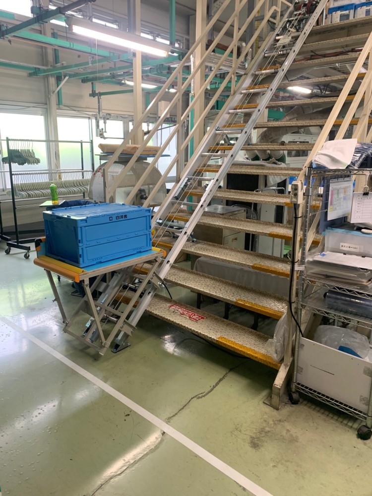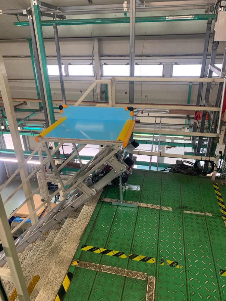 上階台車停止位置。台車水平面の高さは1階同様、H750の高さに合わせました。レール全長・階段角度等で合わせられない場合もありますが、その場合でも作業効率性と安全性を考慮しながらご提案をしております。