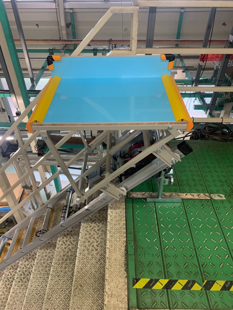 上階台車停止位置。水平面をH750で合わす事により、水平面の半分は階段にかかる形です。この形のリフトは写真右側(踊り場)からでも積み降ろしが出来ますので、水平面右側のカマボコ型モールは無い方が効率は良いですが、使いながら改良するとの事でした。
