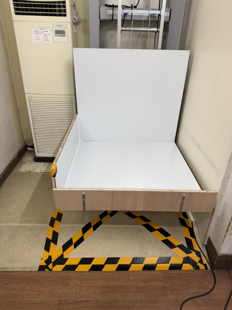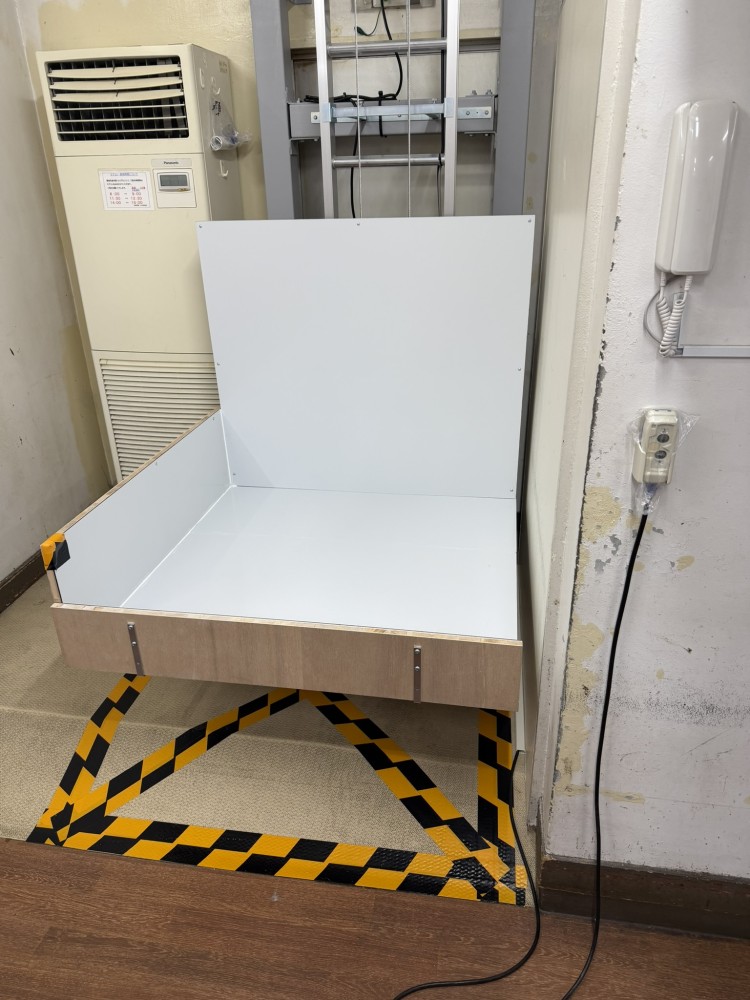 1階台車停止時。板張り床面はW1000×D1000です。左面と手前面は立ち上げ板を付けておりますが、手前面は外しやすい仕様にしております。(今後、蝶番を取り付けて開閉式にする案もありました。)