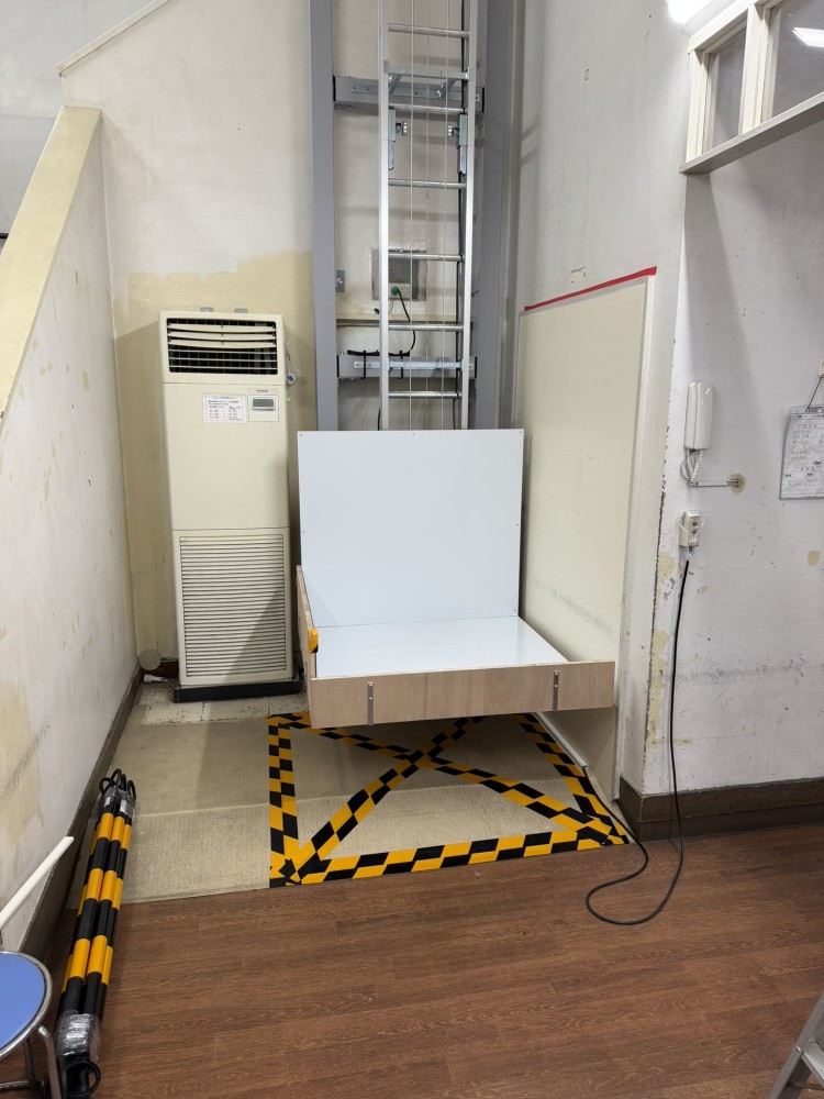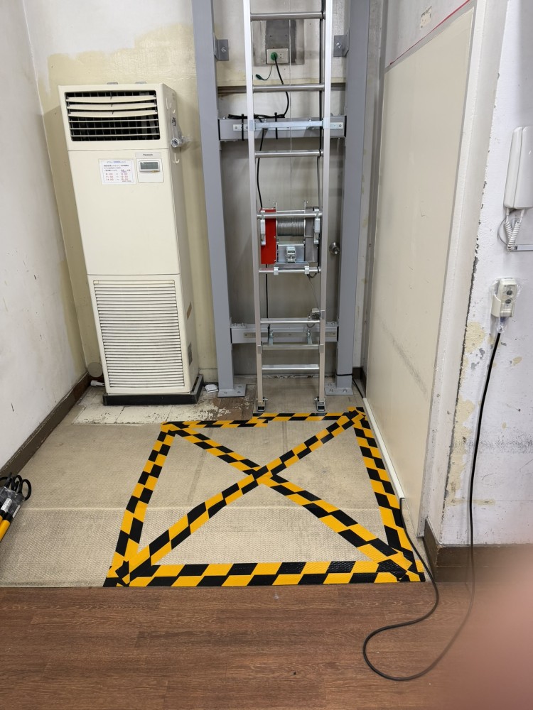 2階に台車がある時の1階。台車停止位置にはトラテープで区画をしております。この場所には荷物の仮置きも禁止ですので、場合によっては柵扉の設置をお願いしております。
