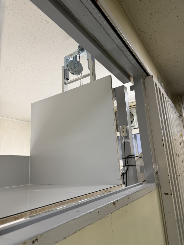 2階台車停止時。2階はこの窓枠跡からの積み降ろしです。台車床面を大きくする場合、奥の荷物が取り出しにくいデメリットもあります。使い勝手が良くなるのがベストですが、多様な場面でのメリットデメリットもお伝えしております。
