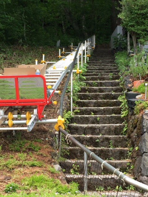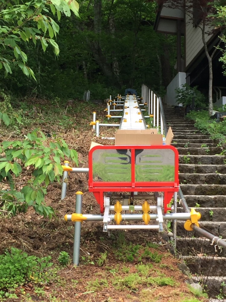 下部近景 階段手摺り上に台車が停止します。