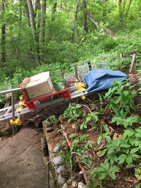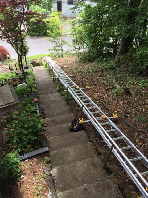 下部からの見上げ。レール受け単管は、右側は手摺り部と左側は単管を地面に打ち込んで固定。